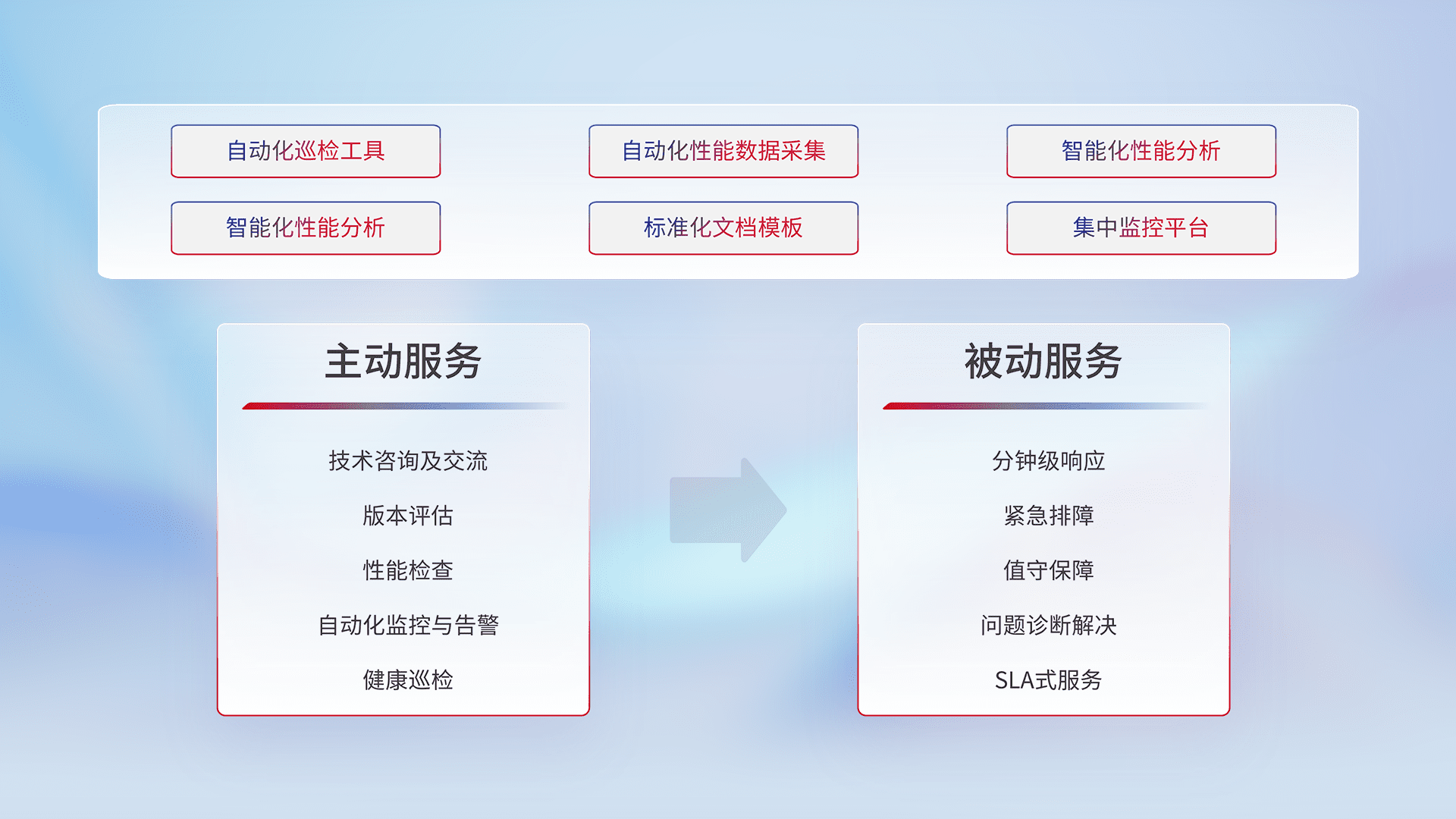 智能化工具和标准化文档,,,保障服务质量,,,,提供主动服务(包含技术咨询、、、版本评估、、性能检查、、自动化监控与告警、、、、健康巡检)和被动服务包含(分钟级响应、、、、紧急排障、、值守保障、、问题诊断解决、、SLA服务)。。